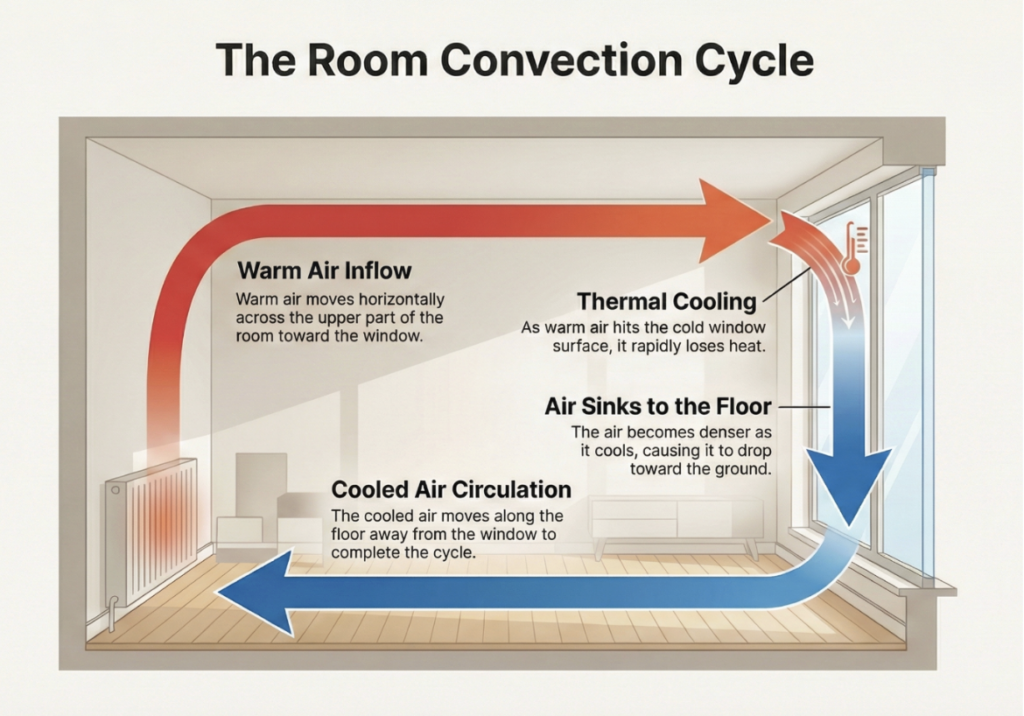 Here’s what was actually going on… The under-performing windows had cold interior glass surfaces. Warm room air would contact that cold glass, lose its heat, and sink. That cooled air would then travel across the floor and get replaced by new warm air descending to meet the glass again. That circular movement is a convection current, and it’s what the homeowners were feeling as a “draft.”